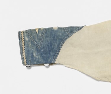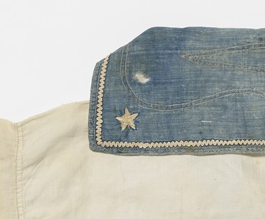 Jefferson followed the old sailor tradition by embellishing his clothing with embroidery. A narrow, naturalistic vine of foliage follows the trousers’ fall, or front flap. Contrasting white stitching decorates the frock’s blue scalloped cuffs. Wavy white cotton gimp outlines the bottom edge of the cuffs and the edges of the neck, while two white embroidered stars complete the collar.