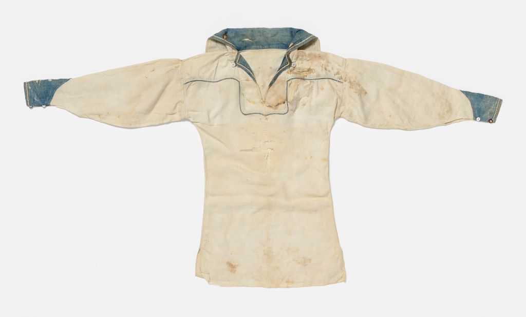 Wearing his best warm-weather frock and trousers in honor of the admiral’s visit, little John T. Jefferson was blown overboard, together with several of his shipmates. He survived, but his suit bears witness to the disaster. Though torn and stained with his blood, the young sailor kept the clothes for the rest of his long life. In 1931, when the newly-restored Constitution visited Annapolis during the three-coast National Tour, Jefferson lent it to a “main street merchant” who displayed it in his window. The merchant “had quite a history of the suit printed and placed near it.” As the old sailor related in a 1933 letter to his daughter, “I am sometimes asked by friends to see it even now at this late date.” He died three years later at the age of 81.