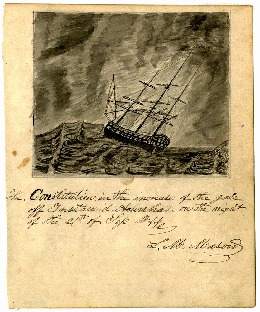 By all accounts he was doing well in his role and enjoying the adventure of world travel, though he did not acclimate to the difficulties of life at sea and looked forward to getting home. Along the way, Mason made sketches of the places he visited and sights he saw. He also kept a diligent midshipman’s journal, a duplicate of the ship’s logbook designed to teach logkeeping skills. Personal journals and accounts written by his shipmates repeatedly mention him by name, citing his impressions and descriptions of the exotic places they were visiting.