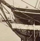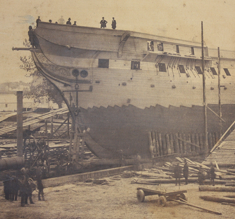 Detail, salt paper print of USS Constitution at the Portsmouth Navy Yard in Kittery, Maine, 1858, showing the 1847 Jackson figurehead carved at the Fowle shop in Boston. Photograph by Albert Gregory. [USS Constitution Museum Collection]