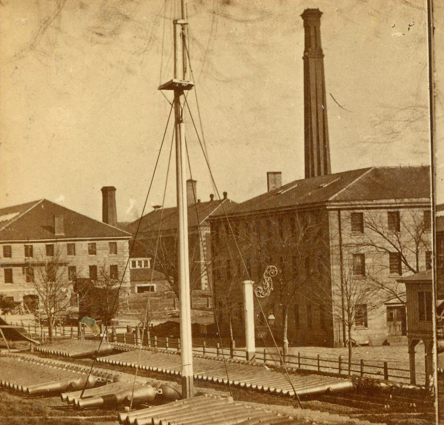 Stereoscopic photograph of Charlestown Navy Yard, c. 1850-1870 showing 1820 USS Constitution billethead displayed on lamp post. [USS Constitution Museum Collection]