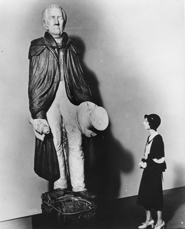 In this c.1930 photograph, a woman stands beside Laban S. Beecher’s original Andrew Jackson figurehead with the second head carved by Dodge & Sons of New York in 1834. [Courtesy Boston Globe Library]