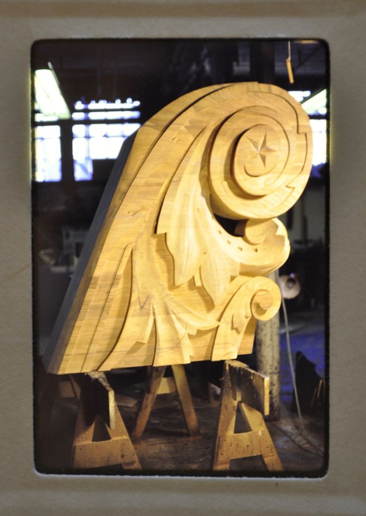 An interesting discovery in the 2015 restoration is that the 1930 trailboards, carved here in the Charlestown Navy Yard, were still decorating Constitution‘s cutwater! The relief-carved acanthus leaf motif that winds down the bow, terminating in a red, white, and blue shield, was cut from solid pieces of old-growth Douglas fir from the Northwest that measured over 5 inches in thickness. After serving their duty for 90 years on “Old Ironsides'” bow, the 1930 trailboards have been retired and will be replaced with newly created duplicate carvings.