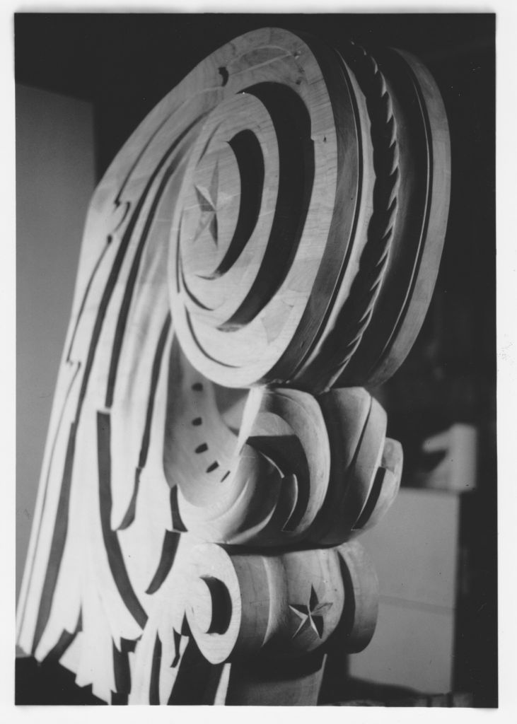 Detail of photograph, 1930, showing the newly carved billethead and trailboards on Constitution’s bow. [Courtesy Naval History and Heritage Command Detachment Boston]