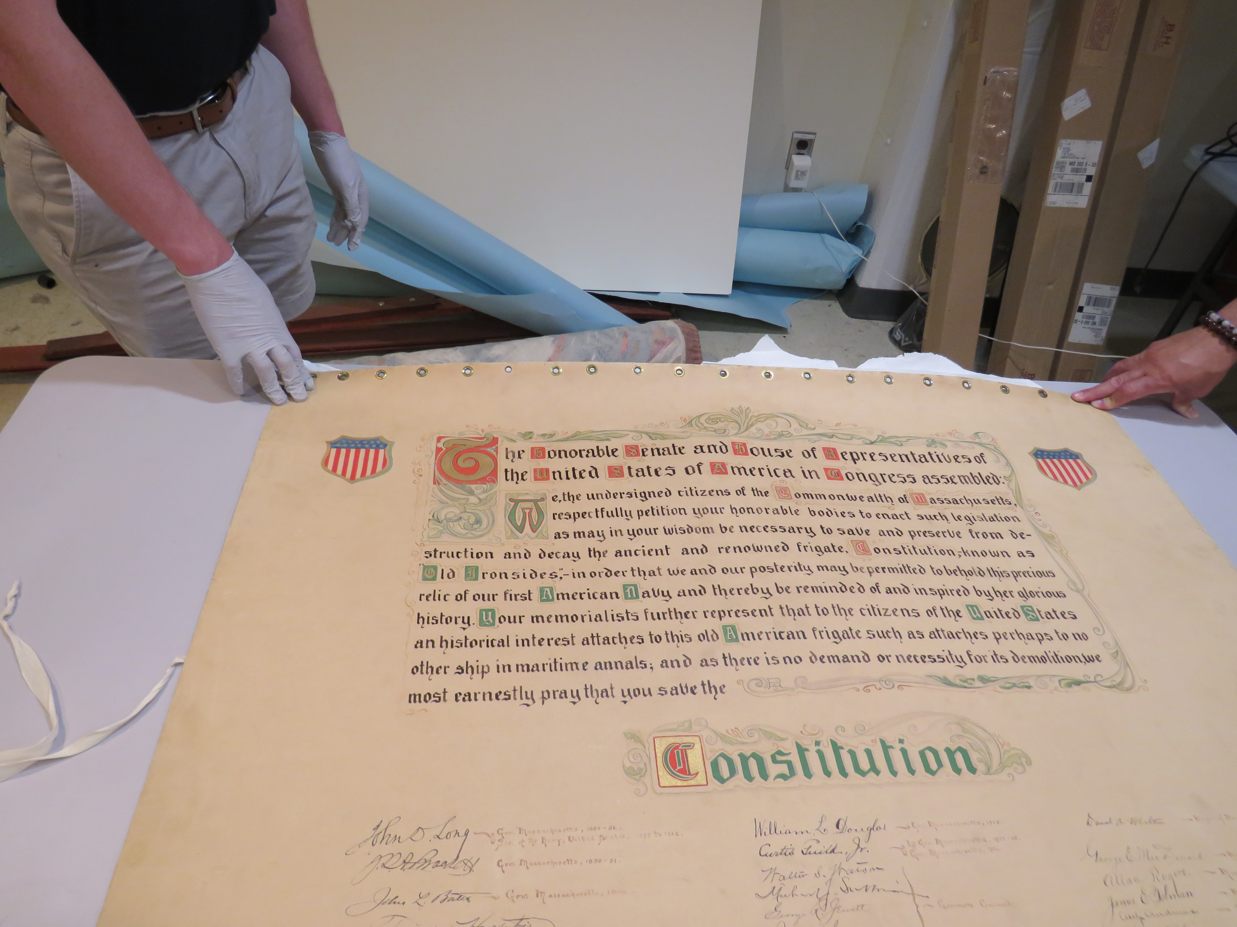 Additional signature sheets matching the size and material of the petition were riveted to each other end-to-end and rolled onto the scroll, eventually producing a 170-foot-long document that Pape took to Washington in late January 1906. He presented the scroll to the House of Representatives, where it was unrolled across the House chambers, covering congressmen’s desks and chairs. The Senate decided there was not enough room in the chamber to similarly display it there, but it was accepted by the Senate and then taken to the White House for presentation to President Theodore Roosevelt. From there, it was displayed in a reception hall outside the office of the Secretary of the Navy, Charles Bonaparte, whose original proposal to scuttle the ship had given rise to the petition drive and Congressional action.
