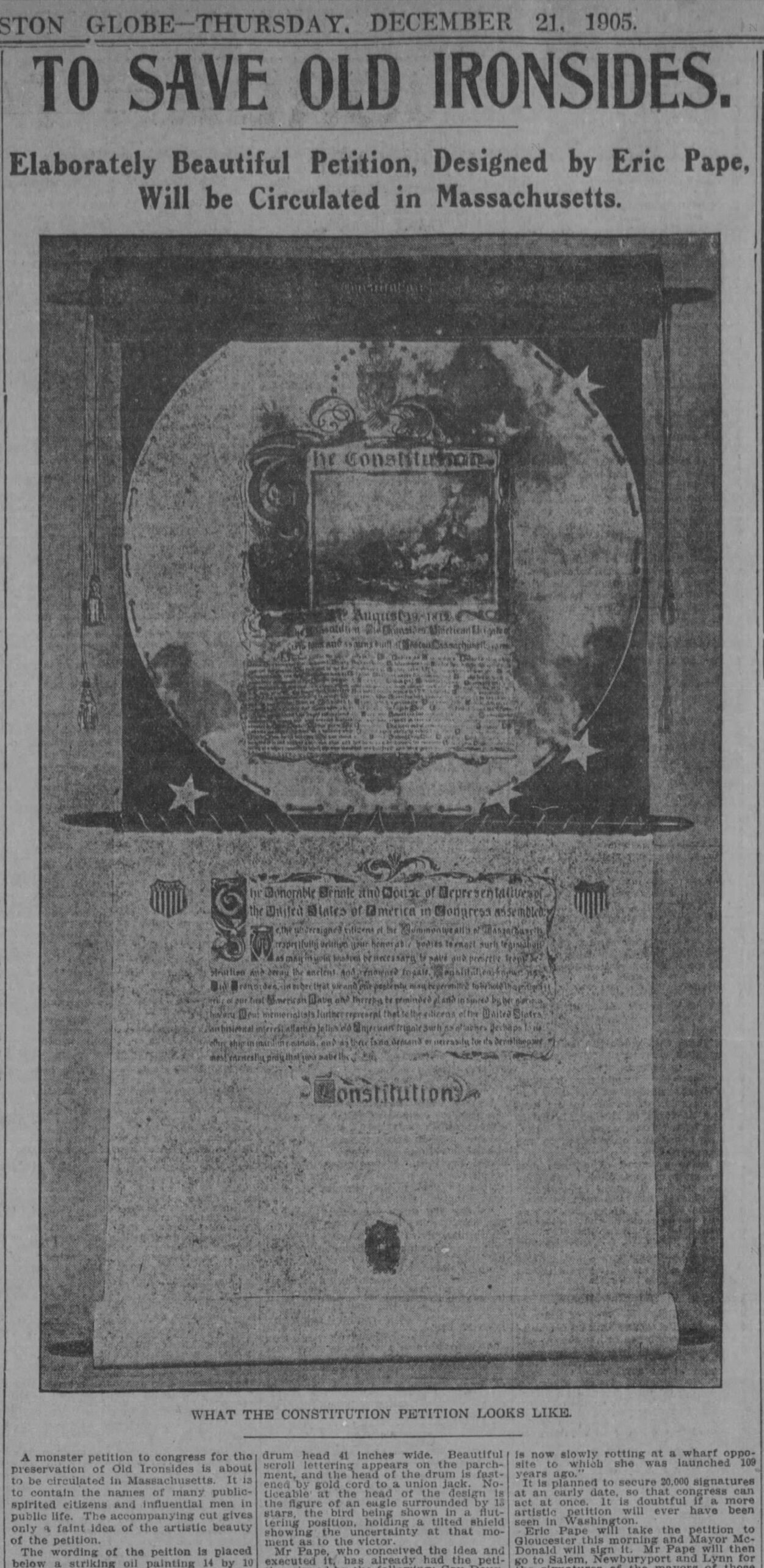 It’s unclear what specifically drew Pape so passionately to the cause of “Old Ironsides,” but his career trajectory and entrepreneurial ambition gave him the tools to succeed. By the time the news of Constitution’s possible demise hit the papers in early December 1905, Pape was well positioned to both attract public attention to the ship’s rescue as well as enlist the support of Massachusetts politicians.