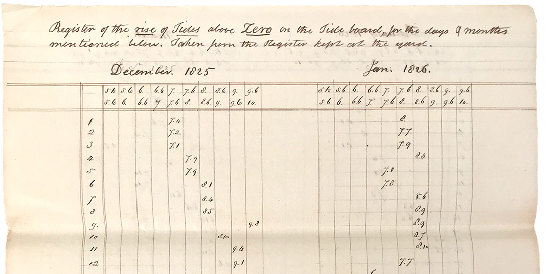 In 2018, researchers Stefan Talke, Andrew Kemp and Jon Woodruff began mining historical archives for tidal records that had not been previously included in the statistical data being used for long-term climate patterns. In addition to Baldwin’s measurements made during the design and construction of Dry Dock 1 in the 1820s and 1830s, they discovered that the U.S. Coast Survey had made nearly continuous measurements at the same location at the dry dock from 1847 to 1877, and that the U.S. Navy measured tides there from 1902 to at least 1911. Stored in boxes for more than a century, none of these records had ever been included in the statistics on sea levels in Boston. But because the dry dock is still intact and still has physical marks used as reference points, it was relatively easy for them to fold the historical data into their study.