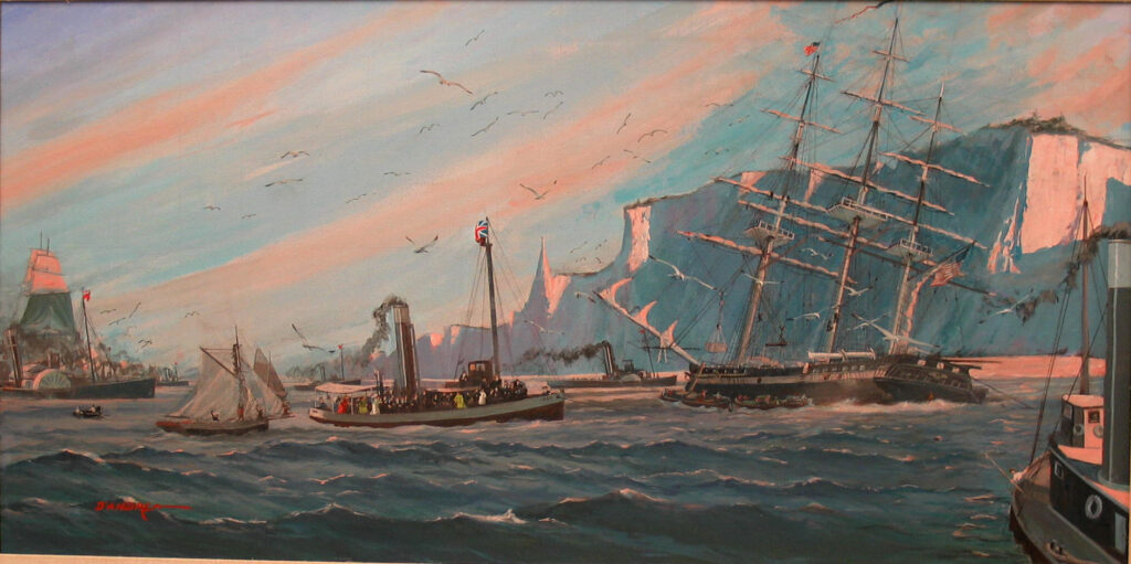 Once everything was secure, Constitution left Le Havre on January 16, 1879, bound for New York. However, it was not smooth sailing. That night, the ship outsailed its navigator’s expectations and ran aground beneath the white chalk cliffs at Bollard Head in the English Channel. The next morning, tugboats arrived on the scene. An inspection at Portsmouth (England) Naval Shipyard revealed that 85 feet of the false keel was ripped away and fortunately, this was only superficial damage. While there was no damage to the actual keel, repairs did delay Constitution’s travels home.