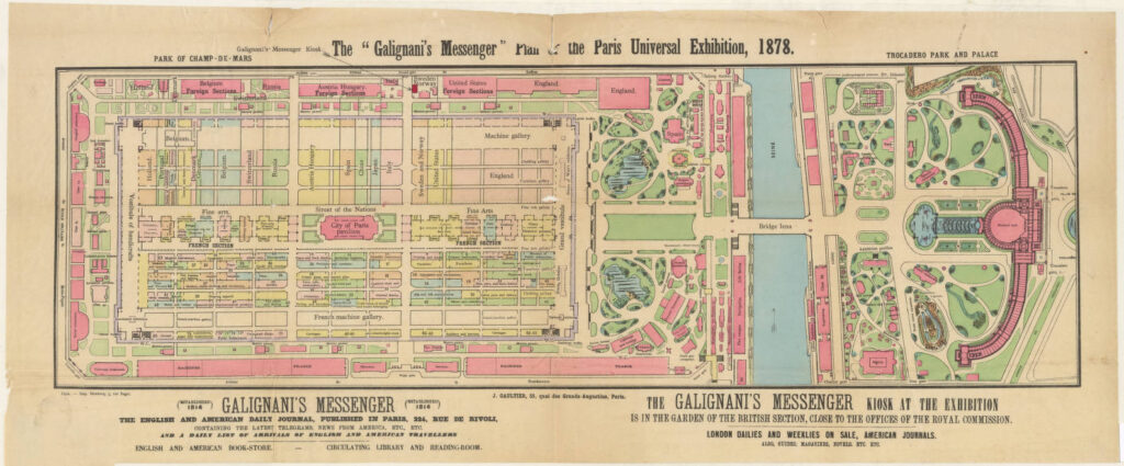 The Galignani’s Messenger Plan of the Paris Universal Exhibition, 1878. Located toward the top of the plan, the American section was between the buildings dedicated to England and Sweden/Norway. [Accessed via the PennState University Libraries.]