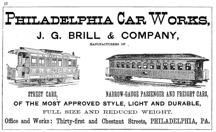 An advertisement for J.G. Brill and Company street and freight cars from The Original 1879 Car-builder’s Dictionary’s Illustrations, Car Plans, and Advertisements. [Accessed via Google Books.]