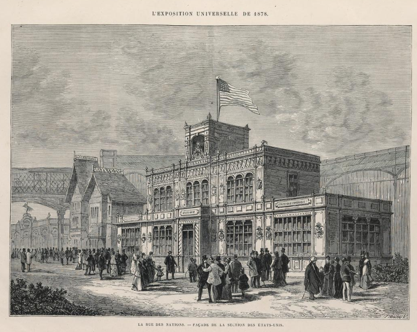 An engraving of the facade of the American pavilion at the Exhibition. Page 53 in L’exposition Universelle de 1878 Illustrée: Quatre-vingt-sept Belles Gravures Sur Bois by Exposition Universelle de 1878 [Accessed via Internet Archive through Getty Research Institute.]