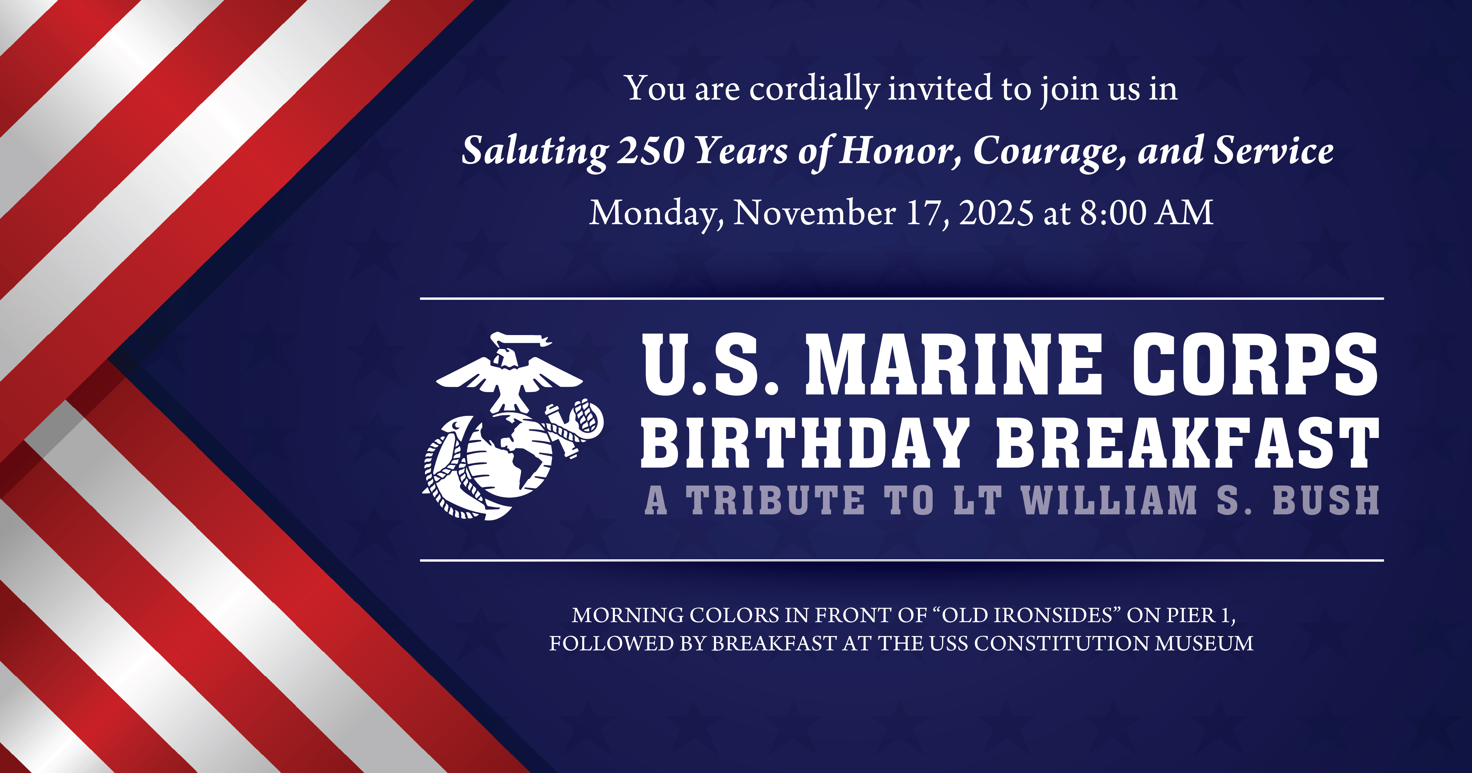 This event celebrates the U.S. Marine Corps Birthday on November 13th and honors the memory of LT William S. Bush, the first U.S. Marine Corps officer to die in the War of 1812. During USS Constitution’s battle with HMS Guerriere the ships exchanged cannon fire until they collided and their rigging became entangled. LT Bush raced to lead his men on board Guerriere, but as he turned to ask Captain Isaac Hull, “Shall I board her?,” he was shot down by the British. Two centuries later, Constitution and the U.S. Marine Corps continue their honorable service to our country. The USS Constitution Museum serves as the memory and educational voice of ‘Old Ironsides’ and ensures that her stories, including those of the U.S. Marine Corps and LT Bush, are preserved and shared with future generations.